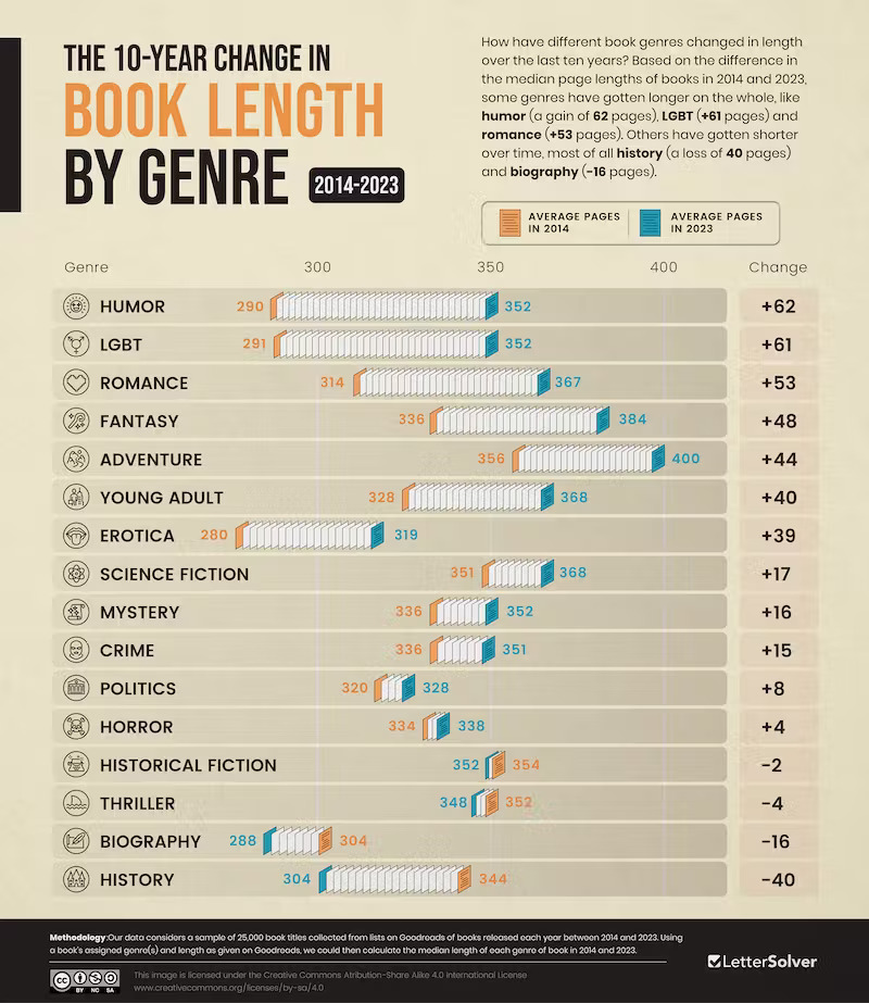 It is no secret that books are getting longer in some genres and shorter in others (e.g. biography or history). This infographic from Letter Solver visualizes the 10-year change in book length by genre: