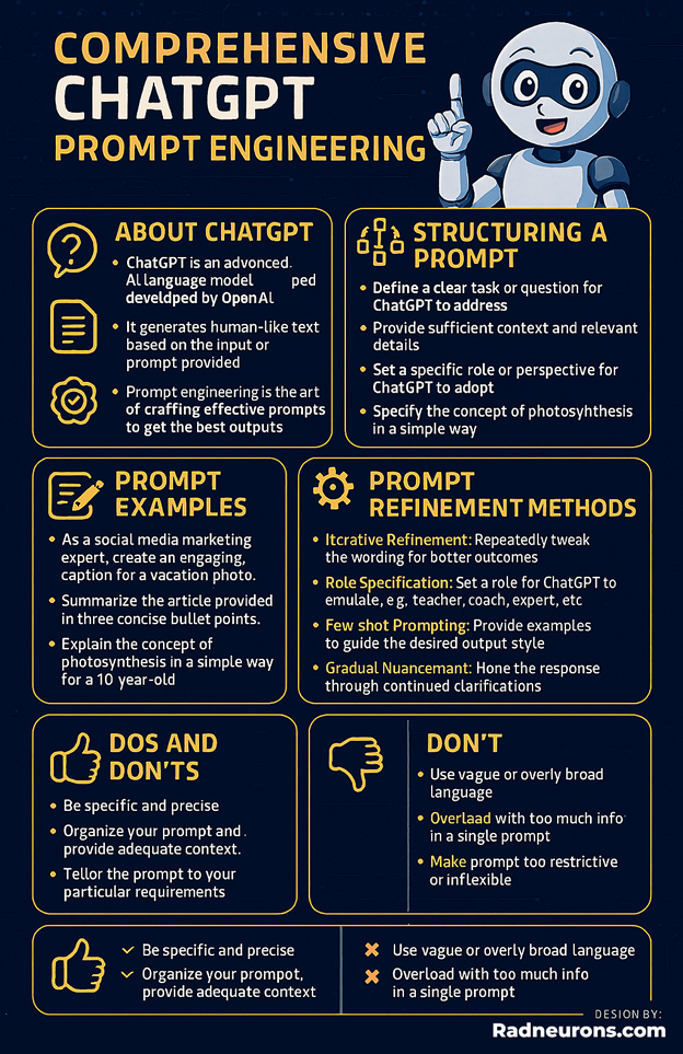 ChatGPT is getting smarter all the time. The latest model can generate higher quality writing. The thinking models are great coding and many other tasks. You still need to have the right kind of prompt to get the most out of ChatGPT. This infographic from Rad Neurons has a few tips on prompt engineering you shouldn’t miss: