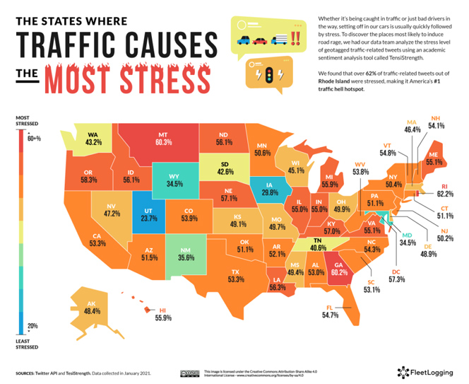 Nobody enjoys working all day and then hours after that in traffic. It could happen to you depending on where you live. In fact, traffic causes stress and anger for a lot of people. This infographic from FleetLogging covers cities where traffic causes the most stress: