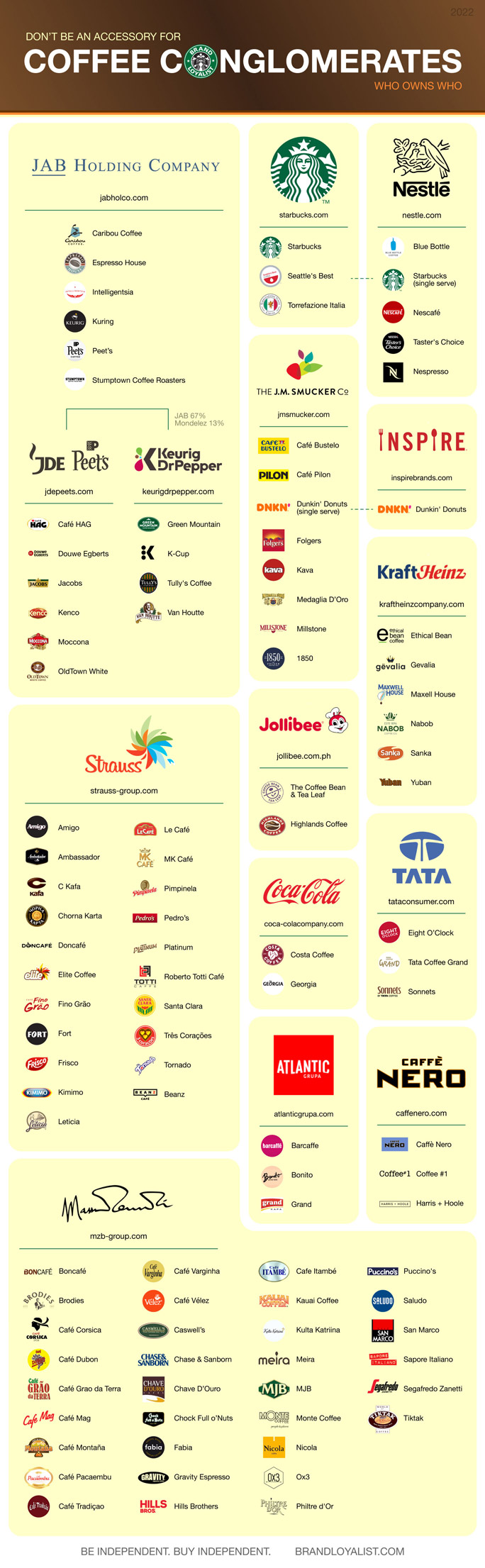 We all enjoy drinking coffee on a daily basis. Did you know that plenty of your favorite coffee brands are owned by just a few giant corporations? This infographic from BrandLoyalist visualizes who owns who in this world:
