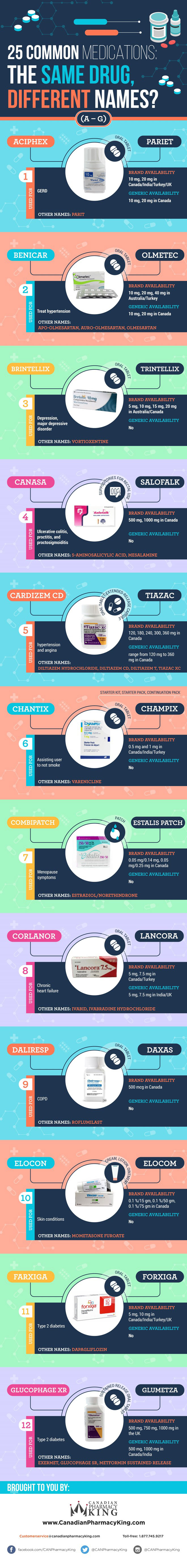 Your favorite medication can go by a number of different names depending on where you live. Brand name medications can be different from country to country depending on where they are marketed, who has access to the patent, and other factors. This infographic from Canadian Pharmacy King takes a look at 25 common medications and the names they go by:
