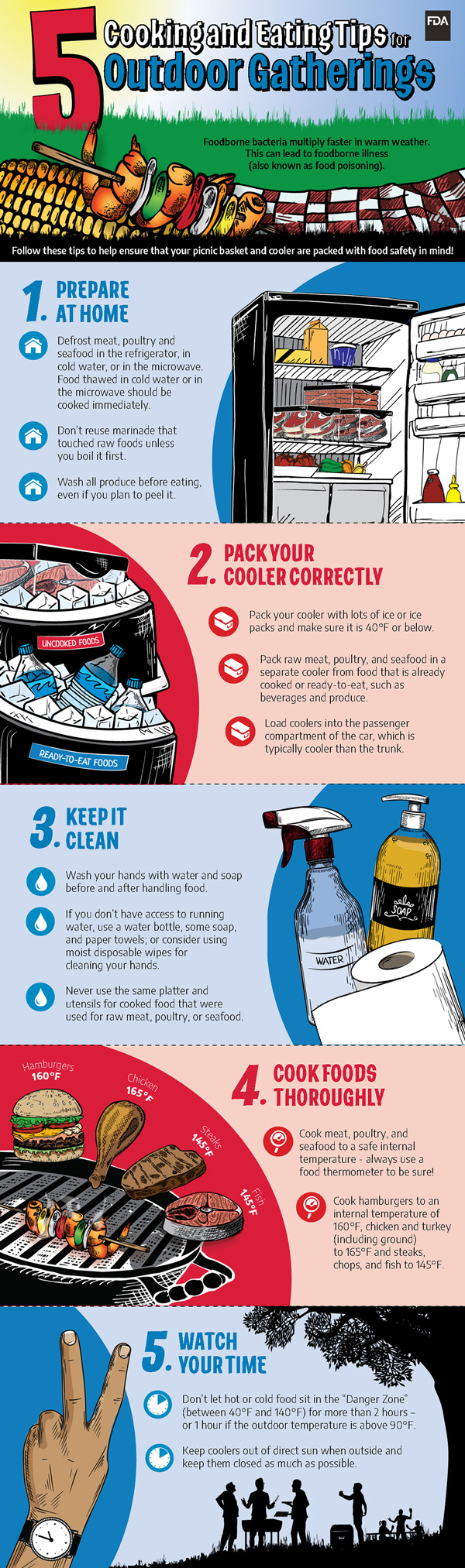 As the weather gets warmer, more people spend time outdoors, cooking and eating. In order to get the most out of your experience, you will want to do your homework beforehand and prepare. This infographic from the FDA has a few tips on that: