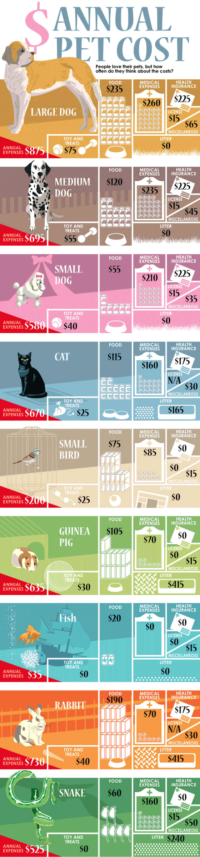 Pets are wonderful to have around. They are great for your health and can help you keep through tough times too. You will have to spend money to take care of them though. This infographic covers the costs associated with owning a pet: