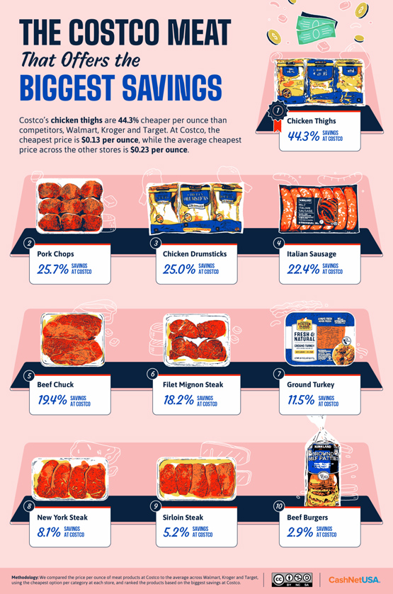 It is no secret that you can save a bunch of money by shopping at Costco stores near you. That applies to a variety of items, including meats. This infographic from CashNetUSA covers the Costco meats that offer the biggest savings:
