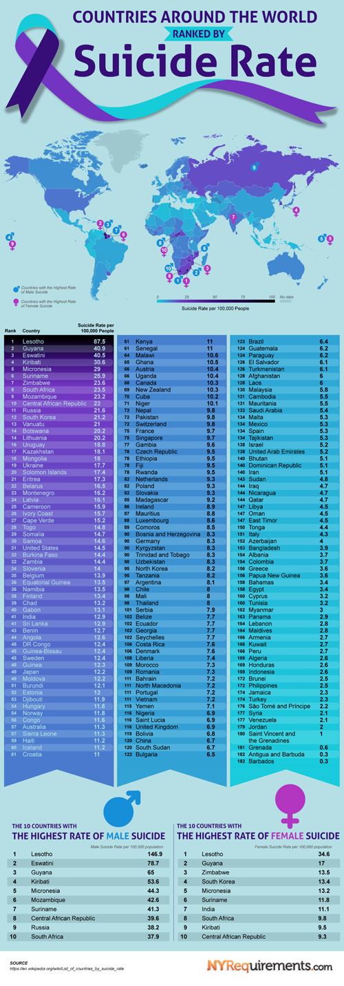 We hear about the alarming rise in suicide rates across various age groups all the time. Have you ever wondered which countries suffer the most from this mental health epidemic? This infographic from NY Requirements takes a look: