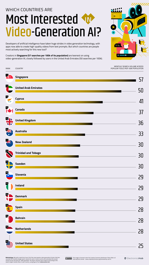 AI can be used to generate text and amazing photos. Thanks to Sora and other similar tools, you will be able to generate amazing videos just with a few words. This infographic from ElectronicsHub covers the countries that are most interested in video generation with AI: