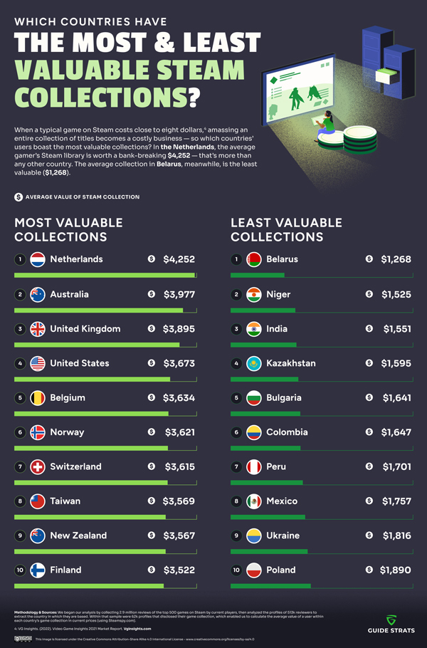 Steam shouldn’t need any introduction to those of you who love gaming. People around the world have tried many titles on this platform. This infographic from Guide Strats takes a look at the countries with the most valuable Steam collections: