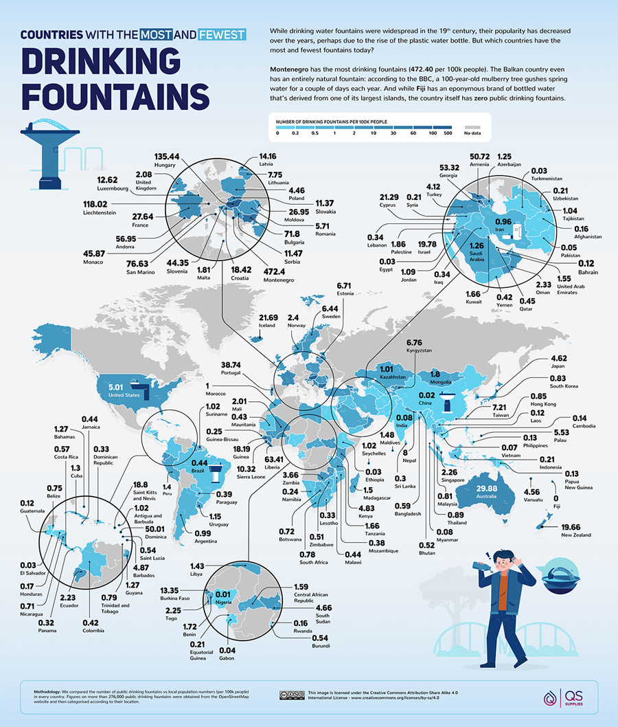Drinking water fountains were widespread in the 19th century. They may be less popular now but you can still find them in various countries. This infographic from QS Supplies visualizes cities with the most and least drinking fountains: