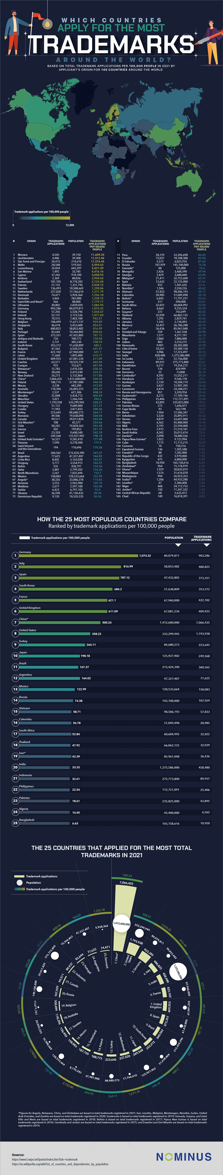Companies around the world apply for trademarks all the time. Not surprisingly, China and United States lead in this area. This infographic from Nominus visualizes countries that apply for the most trademarks around the world: