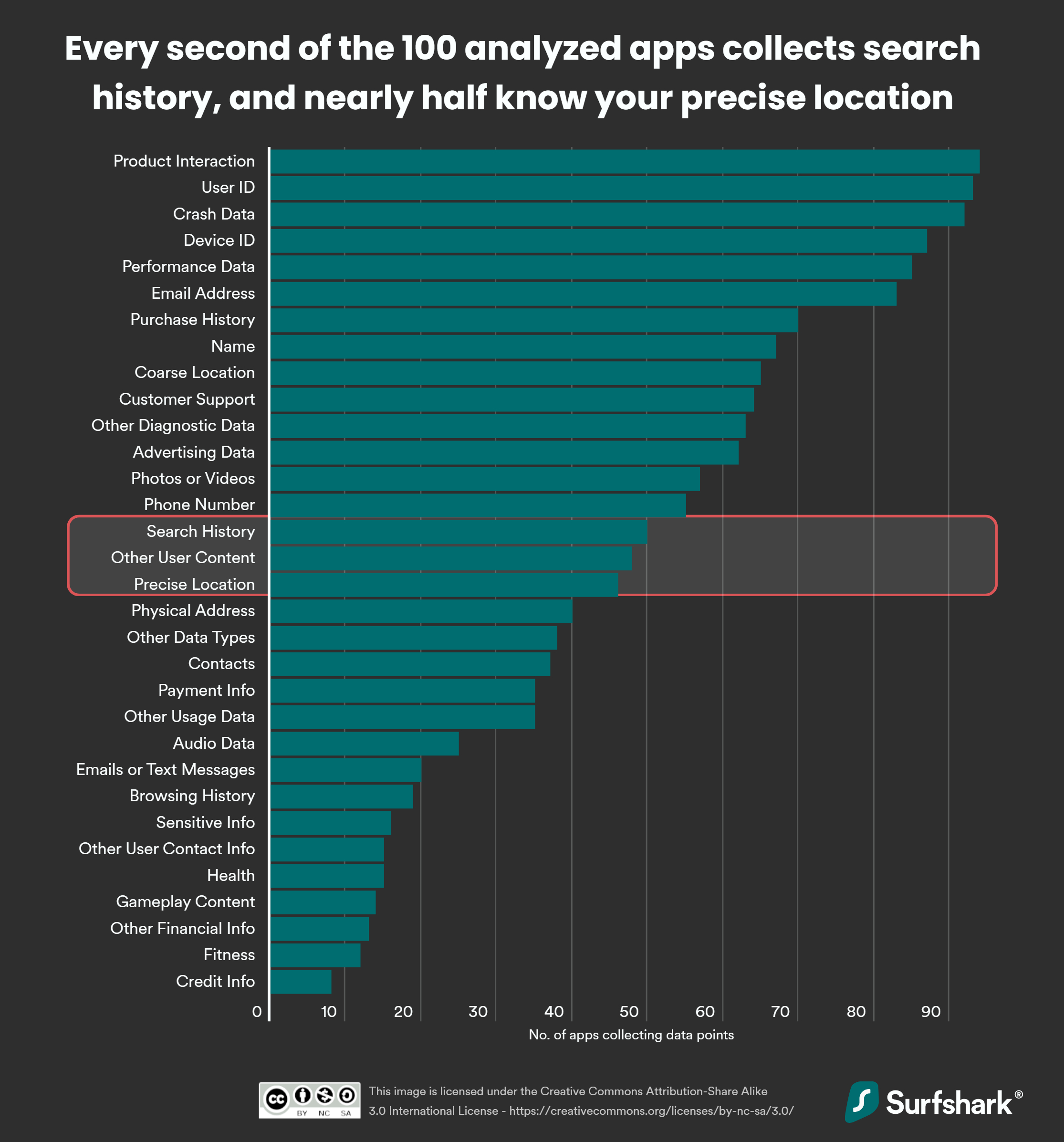 We all know that many apps that we use collect certain data about us. That includes purchase history, email addresses and location. This infographic from Surfshark takes a look at the data popular apps collect: