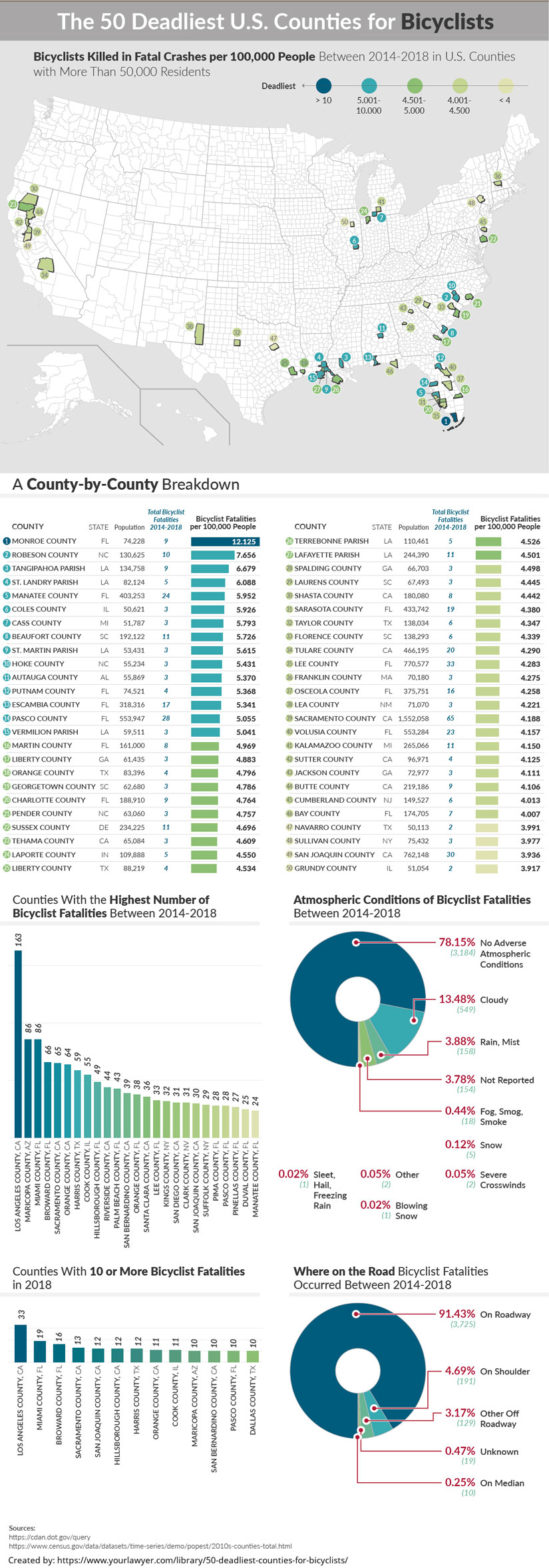 Riding a bike on a daily basis is great for your health but not every neighborhood or county is safe for cyclists. This infographic from YourLawyer.com takes a look at the 50 deadliest U.S. counties for bicyclists: