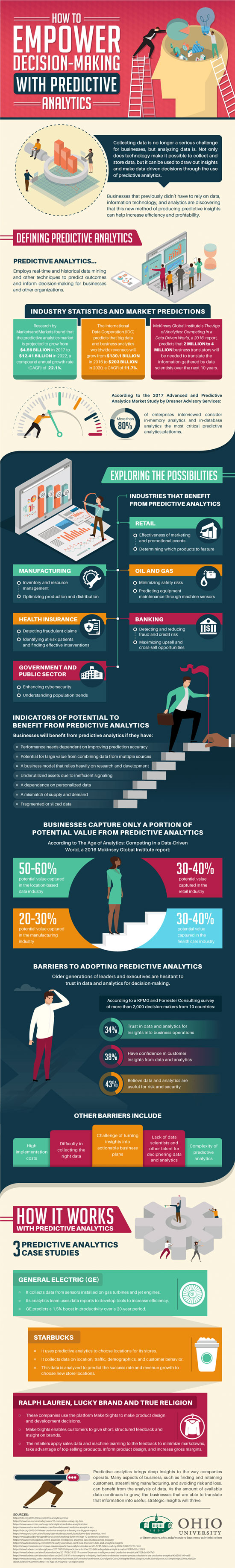 Plenty of companies collect a large amount of data to draw out insights and make better decisions going forward. In fact, predictive analytics solutions are getting more sophisticated all the time. This infographic from Ohio University takes a look at how businesses can make better decisions with predictive analytics:
