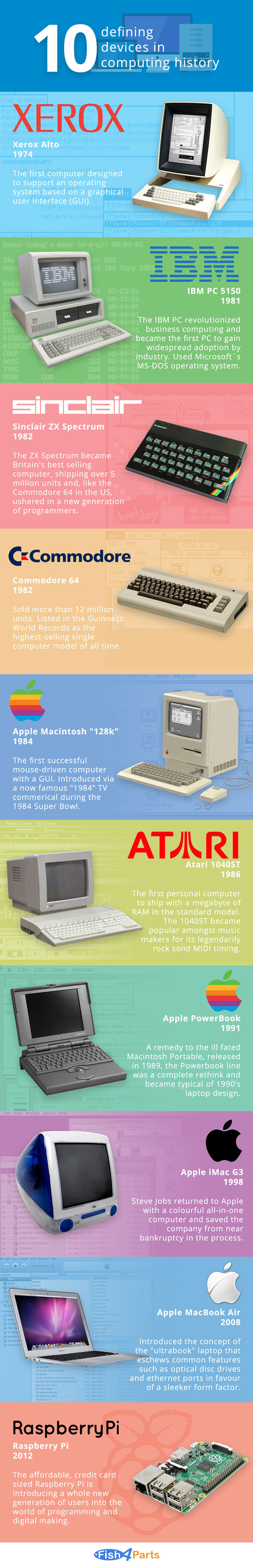 More powerful computers are introduced to the market all the time. Certain devices in the past managed to define a new era of computing at their time. This infographic from Fish4Parts covers the 10 most defining devices computing history: