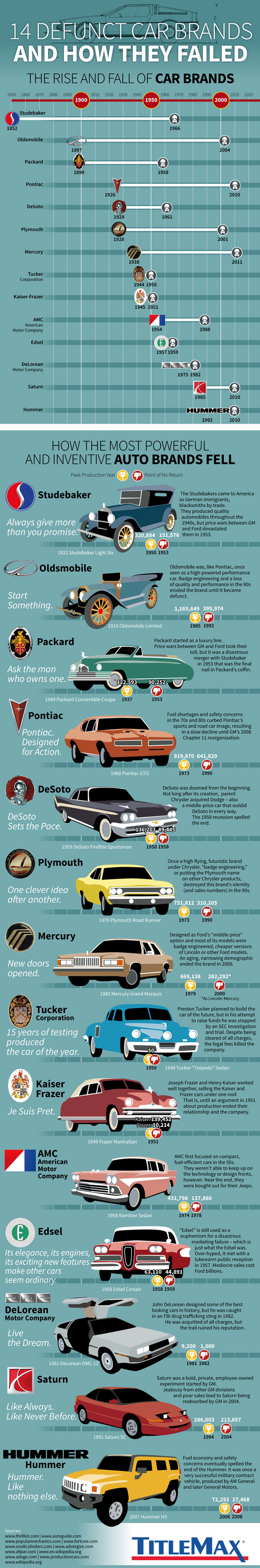 Not every car brand have been a success. In fact, there are many that spectacularly failed. This infographic from TitleMax takes a look at various defunct car brands and why they failed: