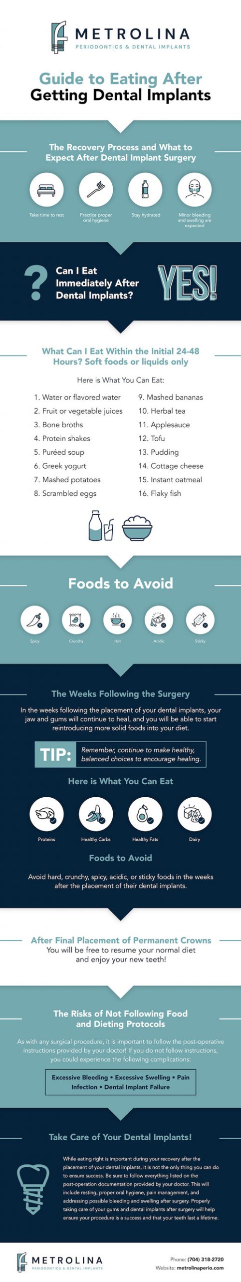 As we get older, our teeth end up with cavities and other issues. With dental implants, you can go back to consuming food like before. You will need to avoid certain types of foods right after your surgery to protect your new implants. This infographic from Metrolina has more information on that: