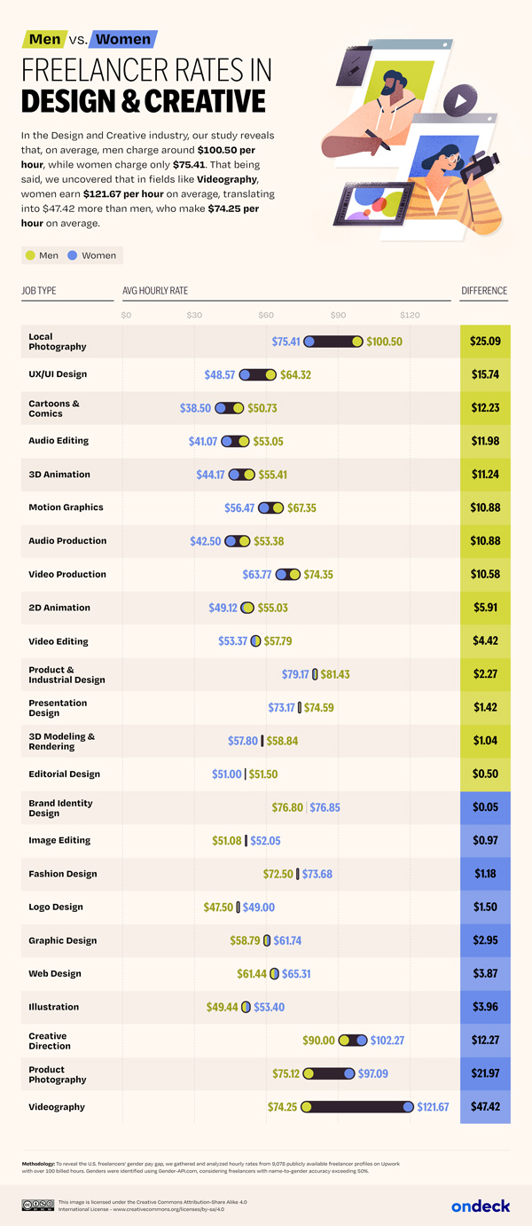 Plenty of companies hire freelancers for design and creative jobs. Have you ever wondered whether men and women are paid similarly? This infographic from OnDeck compares freelancer rates for creative professionals: