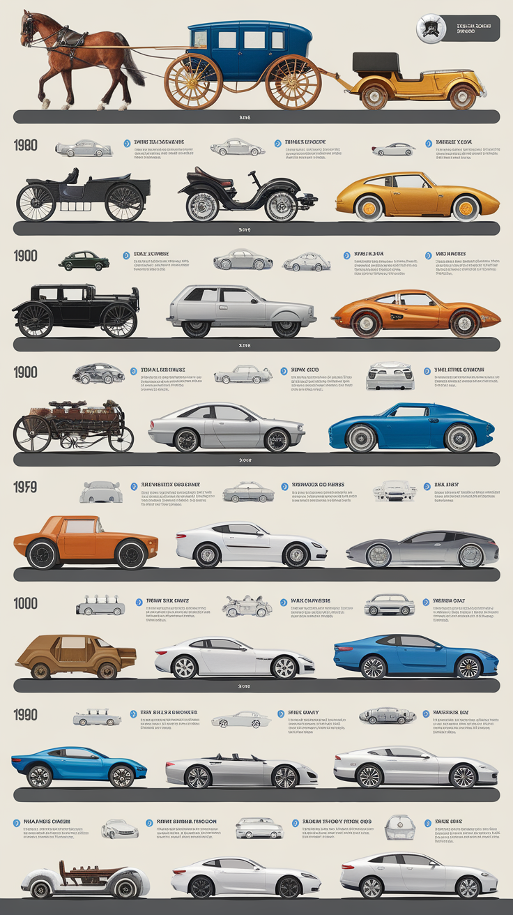 A detailed infographic with a timeline of the history of cars and their evolution since 1900. The infographic starts with a horse-drawn carriage and progresses to early cars with a few wheels and a few cars with more wheels. As time goes on, the cars become more modern, with fewer wheels and sleeker designs. By the 21st century, the cars are electric and self-driving.