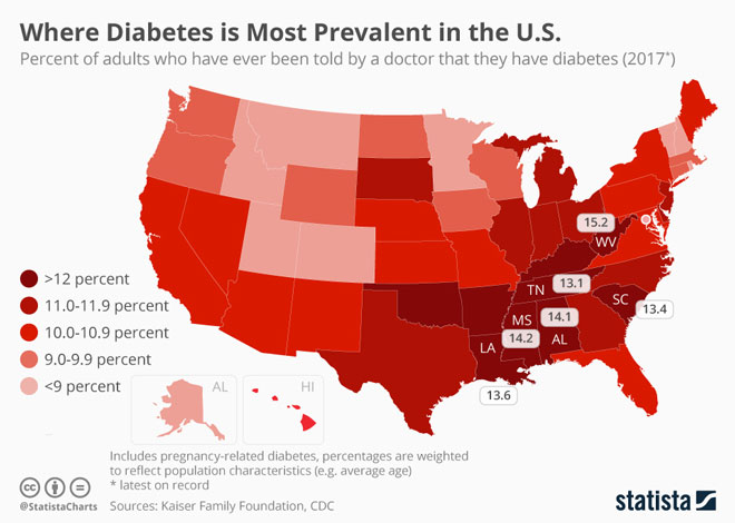 Diabetes is a very serious health issue that many are dealing with throughout their life. Not all types of diabetes are the same. Type 2 diabetes is reversible but requires a change in lifestyle. This infographic from Statista covers where diabetes is most prevalent in the U.S.: