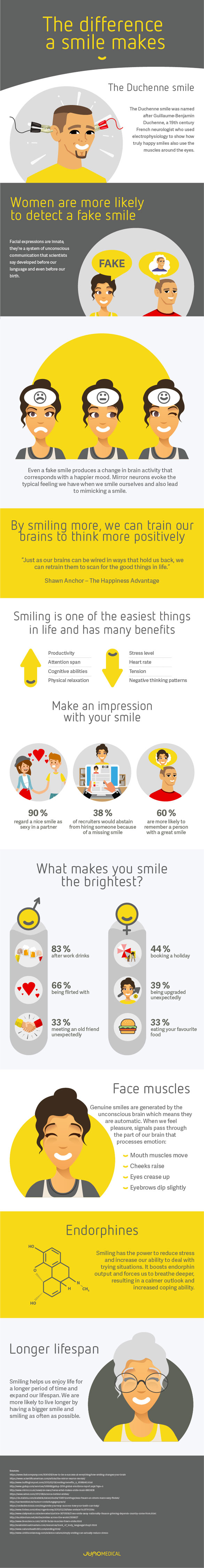 Trying to put a smile on other people’s faces on a daily basis can be very gratifying. You can start by making a habit of smiling more often yourself. This infographic from Juno Medical takes a look a few interesting facts about smiling and its benefits: