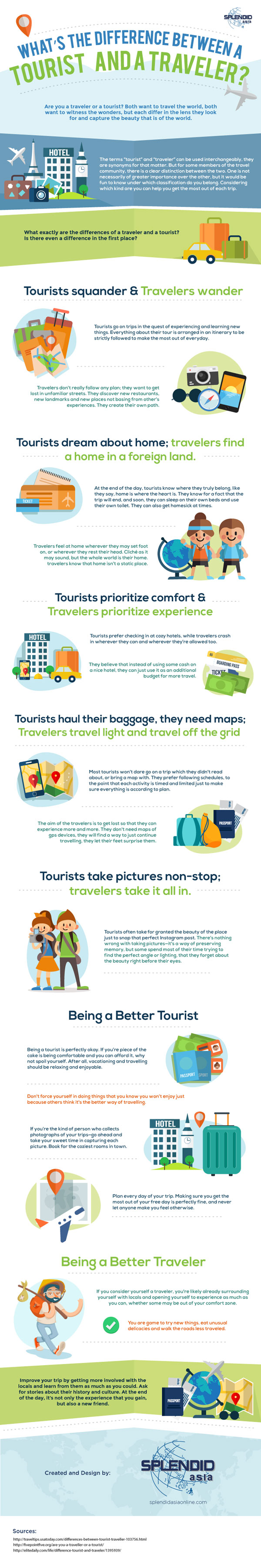 Many of us enjoy traveling around the globe. You wouldn’t want to visit new places and miss must see spots. This infographic from Splendid Asia Online covers a few main differences between travelers and tourists: