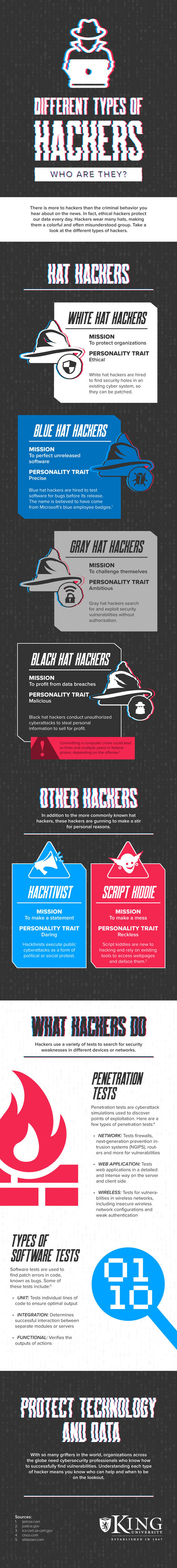 We hear about major hacking attempts all the time. There is more to hackers that you hear in the news. This infographic from King University takes a look at different types of hackers and what they do: