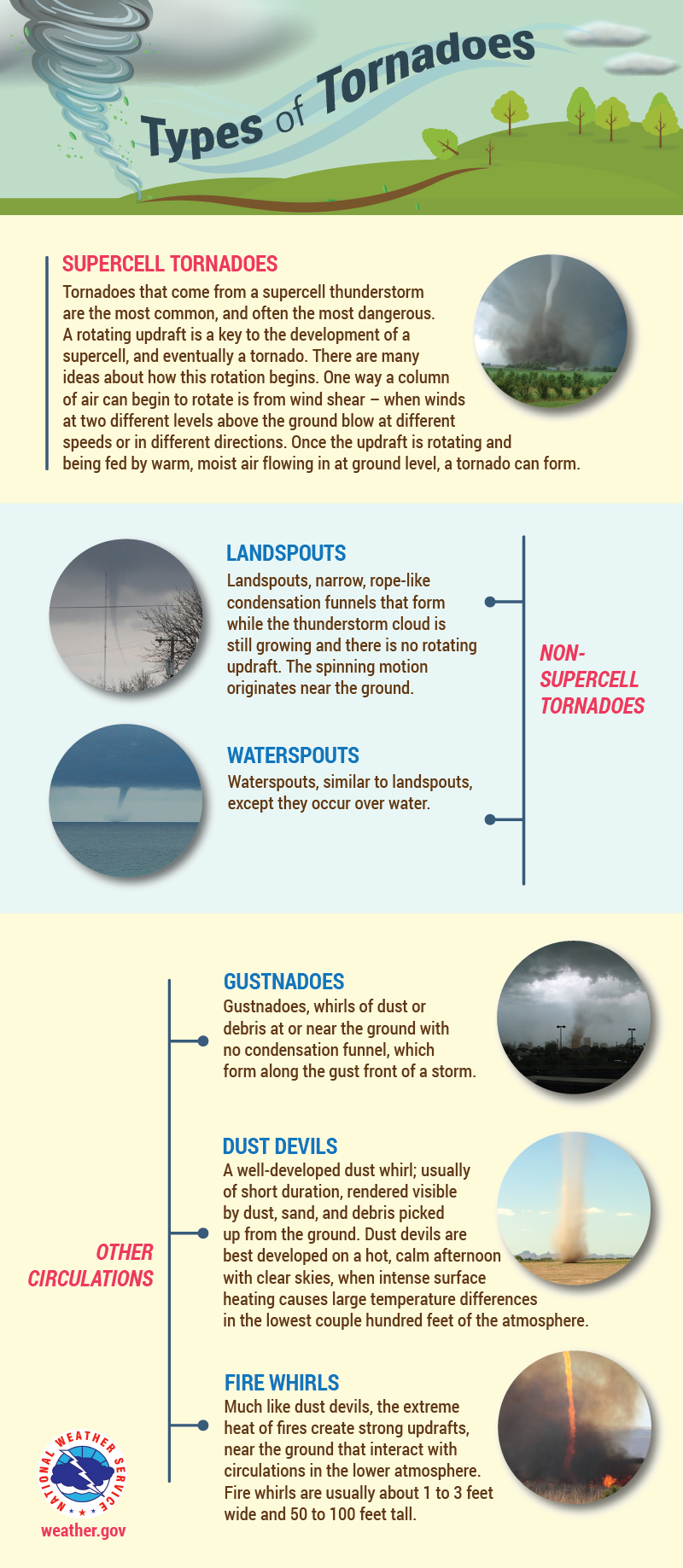 Tornadoes can be quite scary to experience in person. Not all of them cause the same level of destruction though. This infographic from Weather.gov takes a look at different types of tornadoes: