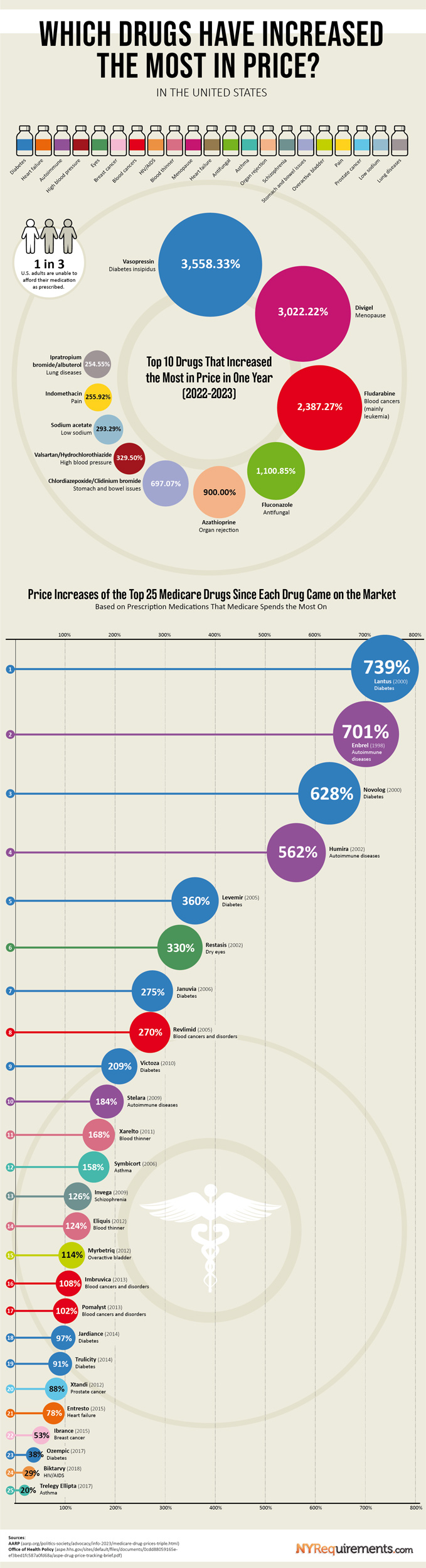 Many of us have to take drugs for pain, high blood pressure and other serious health issues. Unfortunately, drug prices don’t always stay the same. This infographic from NY Requirements covers which drugs have increased the most in price: