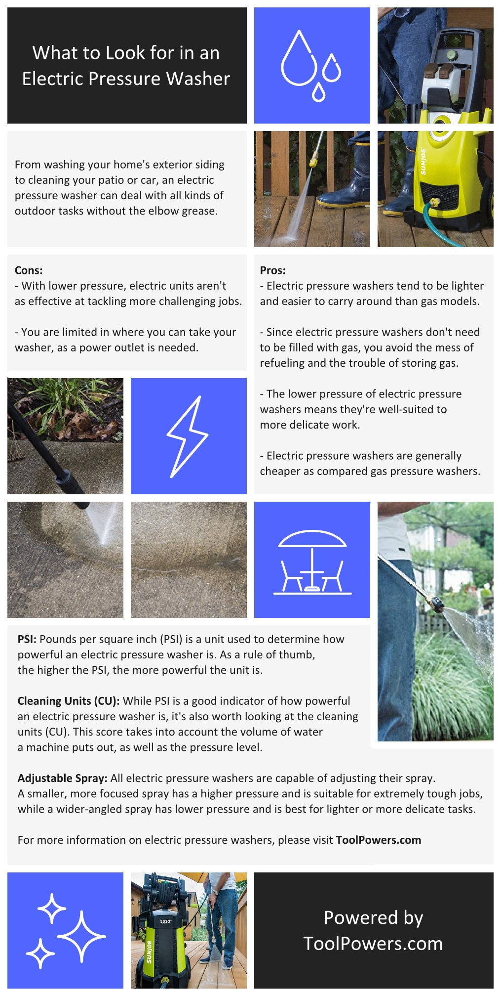 Pressure washers are handy tools to use to clean your car, patio, and anywhere else around your property. When buying a new electric pressure washer, you should do your homework to pick the one with the features that match your needs. This visual from Tool Powers shows you what to look for in an electric pressure washer: