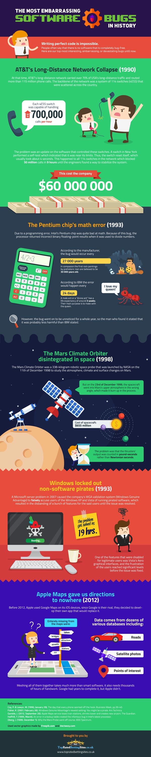 Every software has bugs, but some are more embarrassing than others. This infographic from TopRatedBettingSites takes a look at some of the most embarrassing software bugs in history: