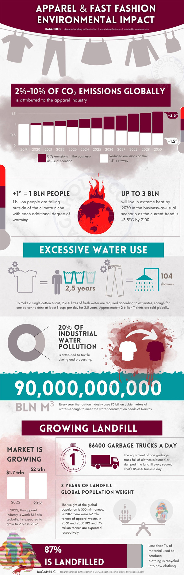 It is no secret that overconsumption and overproduction in the fashion industry has an impact on the environment. Did you know that the fashion industry uses 95b cubic meters of water every year? This infographic from Bagaholic B.V. takes a closer look: