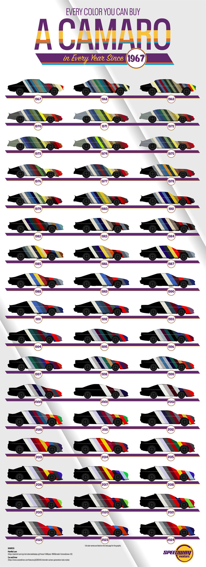 The Chevrolet Camaro has had a vibrant history of colors. Each model year offers a unique palette. For example, the 2024 model has 11 exterior colors available. This infographic from Speedway Motors covers every shade of Camaro since 1967: