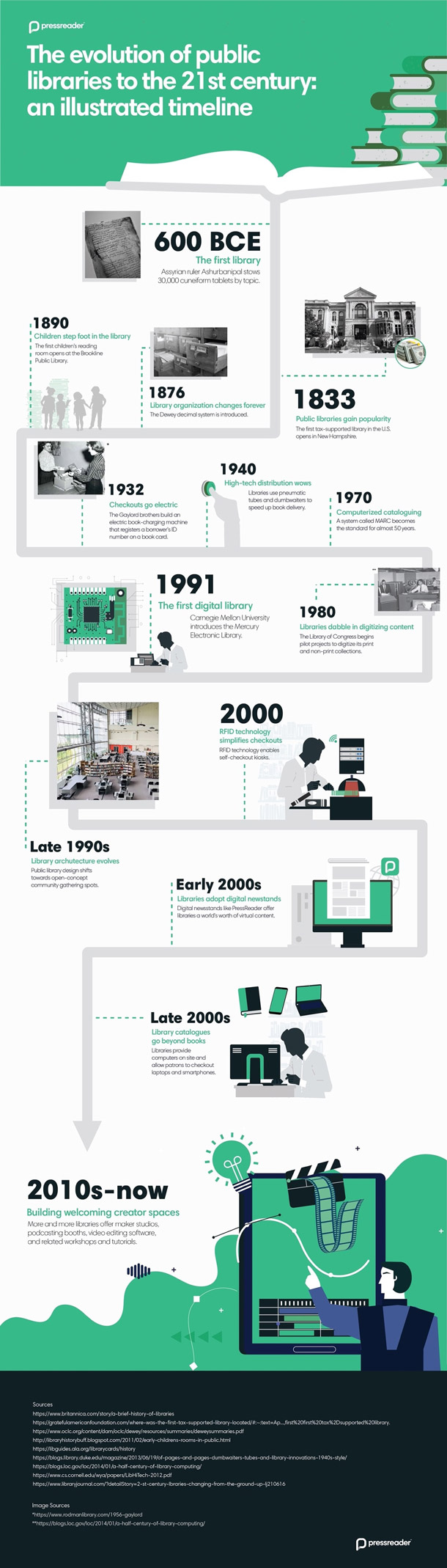 Many older folks spent a lot of time studying in public and school libraries white growing up. These days most people do most of their studying online. This infographic from Pressreader takes a look at the evolution of public libraries since 600 BCE: