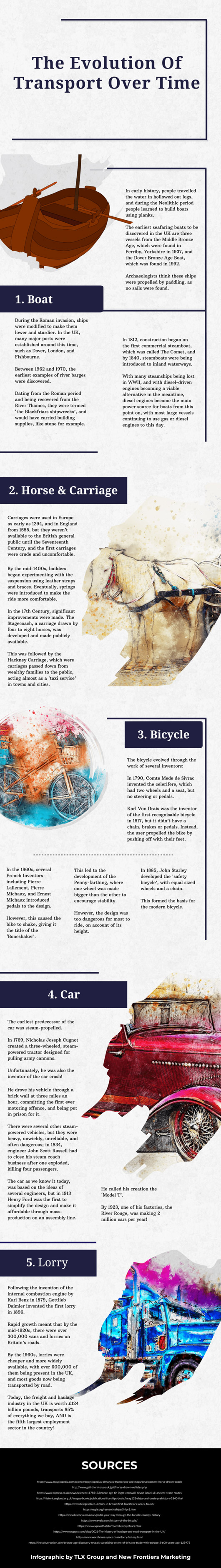 We are all excited about self driving cars and flying vehicles these days but not everyone appreciates how we got here. From the invention of the wheel all the way to modern cars, each leap forward in transportation has revolutionized our way of life. This infographic from TLX Group visualizes the evolution of transport over time: