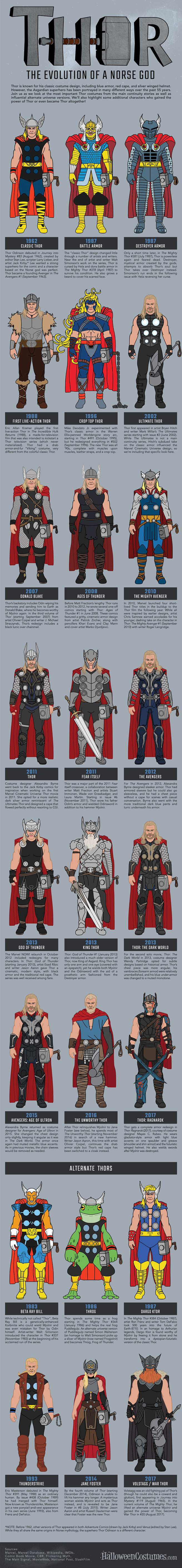Thor is one of the most popular superheros with plenty of appearances in comic books and movies. It has evolved a lot over the past few decades. This infographic from Halloween Costumes takes a look at the evolution of this Norse God: