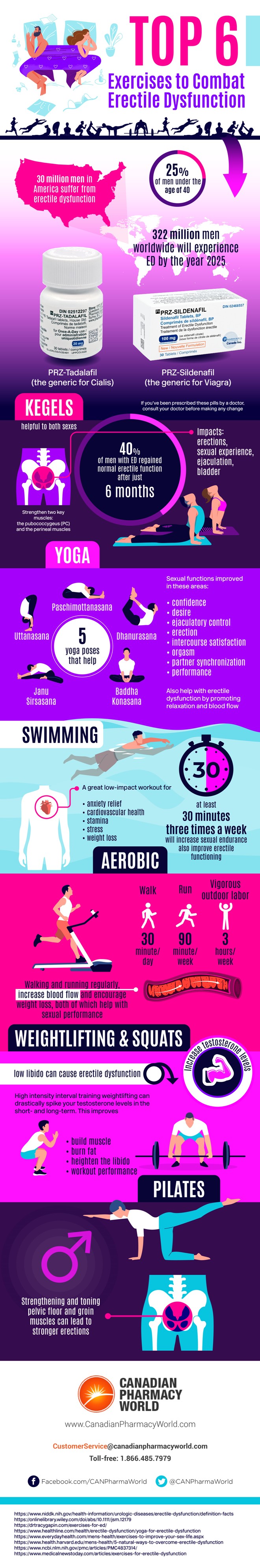 Erectile Dysfunction is a condition many men have had to deal with in the past. It is usually a medial and physical issue, so exercise and medication can alleviate it. Swimming, pilates, and kegel exercises are just a few things you can try to address this condition. This infographic from Canadian Pharmacy World covers top 6 exercises to combat erectile dysfunction: