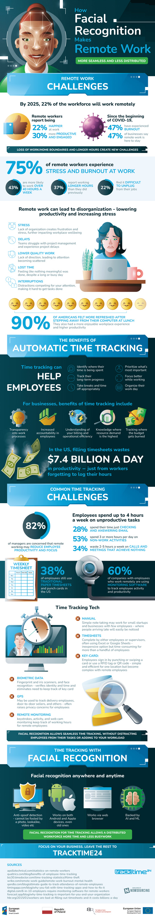 It is no secret that plenty of companies are using technology to transform their work environment. Plenty of workers are expected to get their job done remotely by 2025. This infographic from TrackTime24 takes a look how facial recognition will be used for remote work: