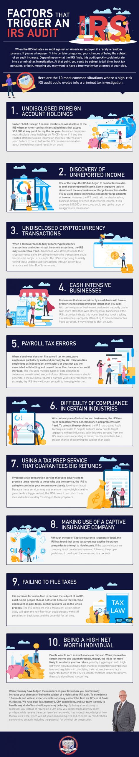 Getting audited by the IRS can be a scary proposition. You could get audited even if you have done everything by the book but that is more likely to happen if you do not report all your income or make glaring errors in your tax return. This infographic from Klasing Associates covers factors that can trigger an IRS audit: