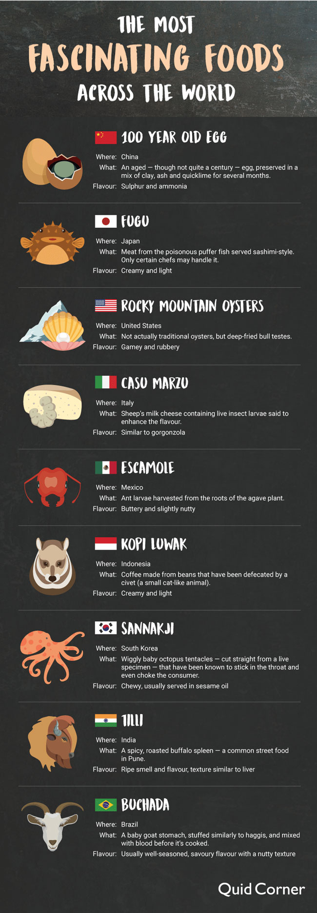 By traveling around the world, you will get to taste dishes exclusive to only certain countries. This infographic from Quick Quid takes a look at some fascinating foods you should know about: