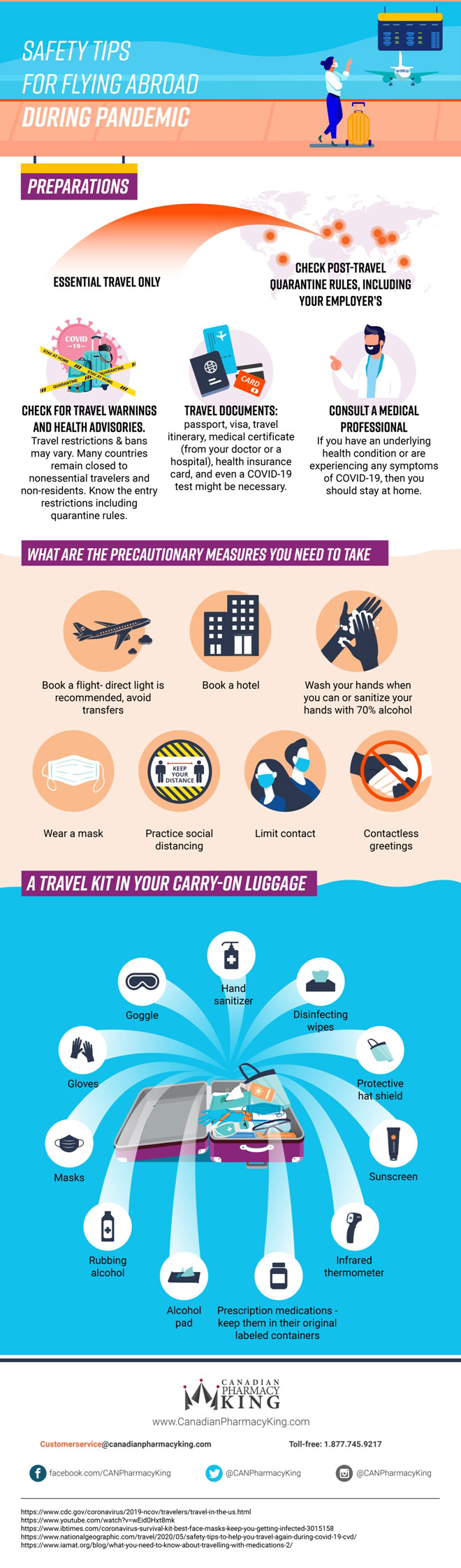 COVID-19 is changing the way we work, shop, and travel. In fact, traveling abroad has become a lot more challenging and not allowed to every region. You will need to do your homework to stay up to date with health advisories, requirements, and risks that you may face in the area you are traveling to. This infographic from Canadian Pharmacy King has a few essential safety tips for travelers during the current pandemic: