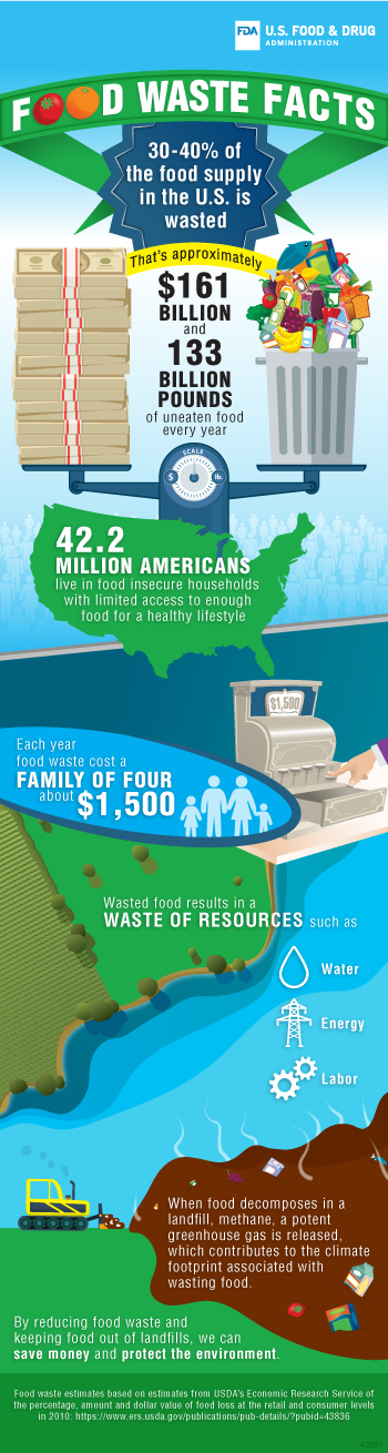 Many of us are guilty of wasting food. Did you know that up to 40% of the food supply in the US is wasted? This infographic from the FDA takes a closer look:
