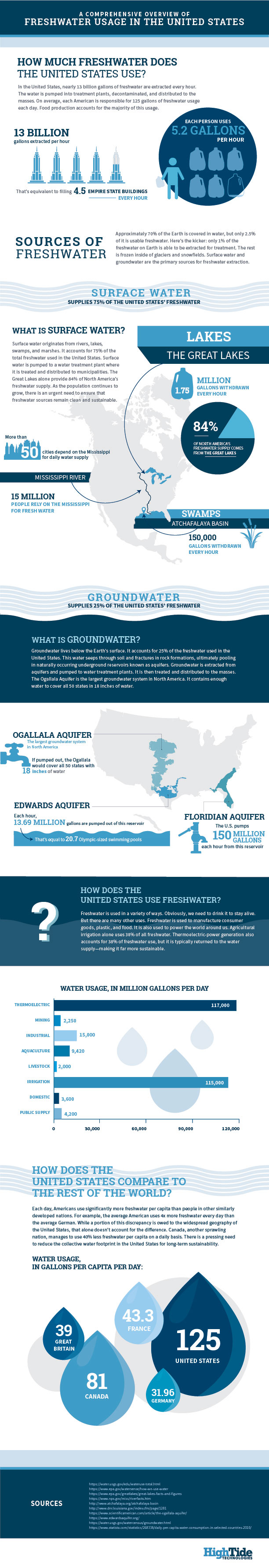 Water is vital to human survival. We not only need it for drinking but also for our plants, fish, and animals. While many of us don’t live near freshwater sources, Americans are responsible for 125 gallons of freshwater usage each day. This infographic from High Tide Technologies takes a comprehensive look at freshwater usage in the United States: