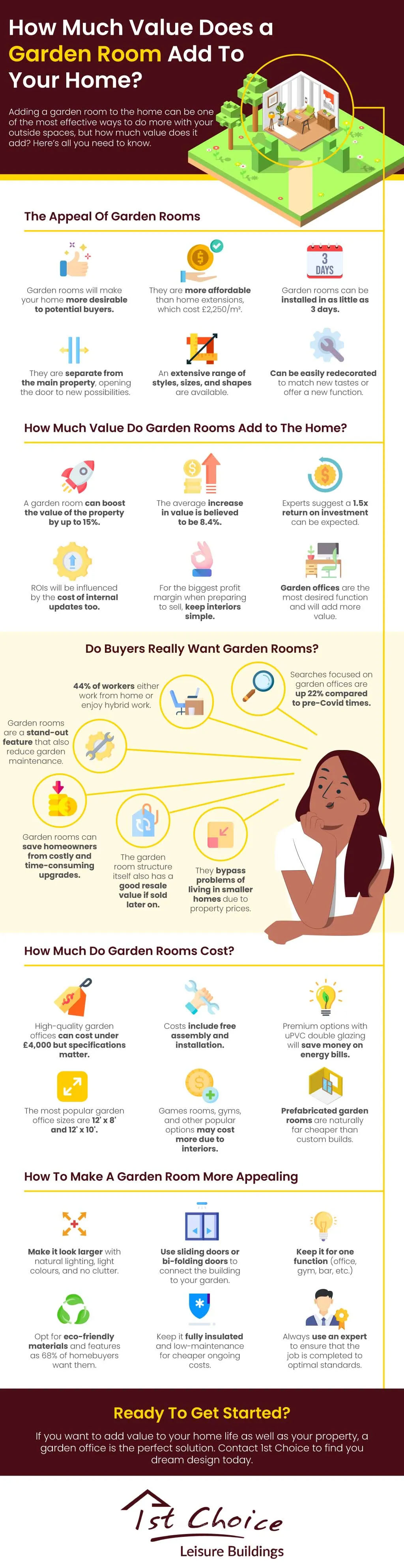 We all would love to increase the value of our home. Improving your kitchen, bathroom, and other areas are just one way to do that. This infographic from 1st Choice Garden Rooms covers how much value you can add to your home with a garden room: