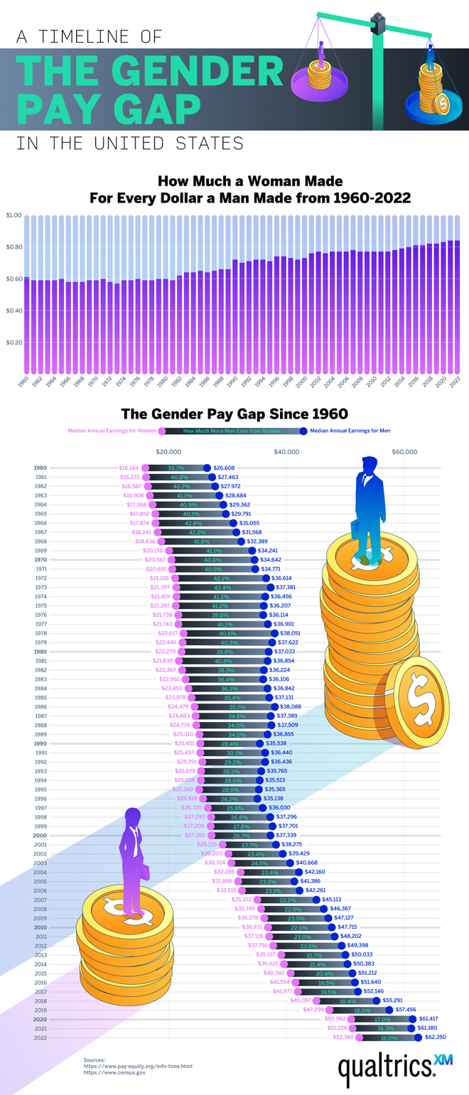 We hear about the issue of gender pay cap all the time. Laws such as the Equal Pay Act in 1963 have reduced the gap but more work is needed in this area. This infographic from Qualtrics visualizes the issue of gender gap: