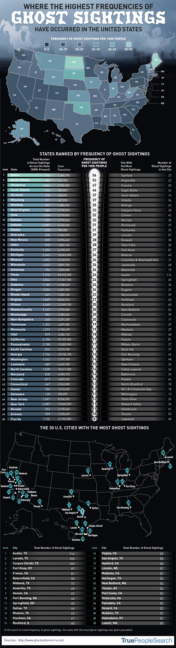 There are plenty of shows dedicated to exploring haunted houses and areas around the world. Have you ever wondered where most ghost sightings happen in the United States? This infographic from TruePeopleSearch takes a look:
