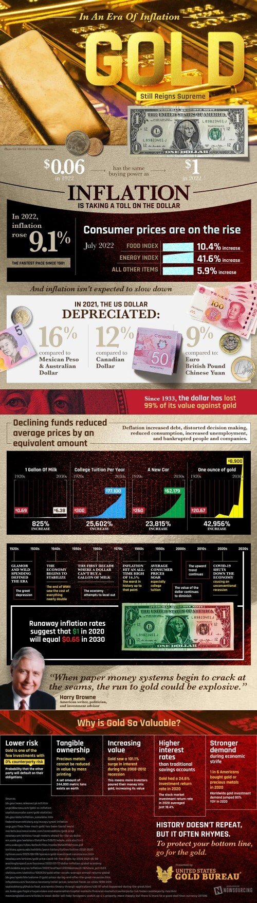 We hear about inflation and rising prices all the time these days. Plenty of people are looking for ways to protect and growth their wealth in these uncertain times. Could gold be the answer in this inflationary period? This infographic from United States Gold Bureau takes a look: