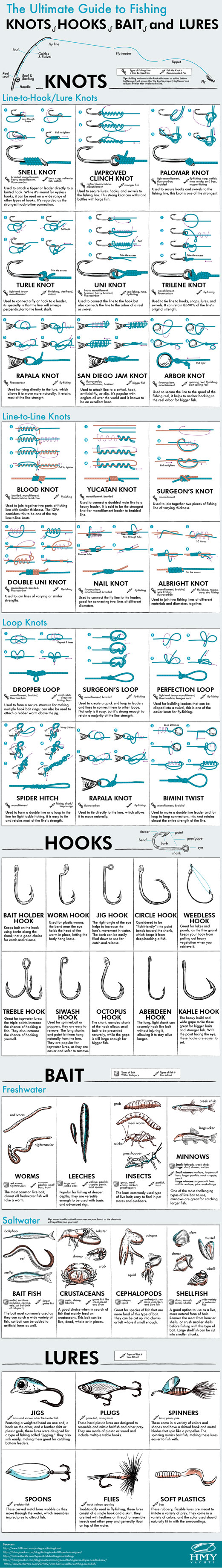 Knowing your knots is quite helpful if you are serious about outdoor adventures. If fishing is your thing, you can use this infographic from HMY Yachts to learn about different knots, hooks, and baits: