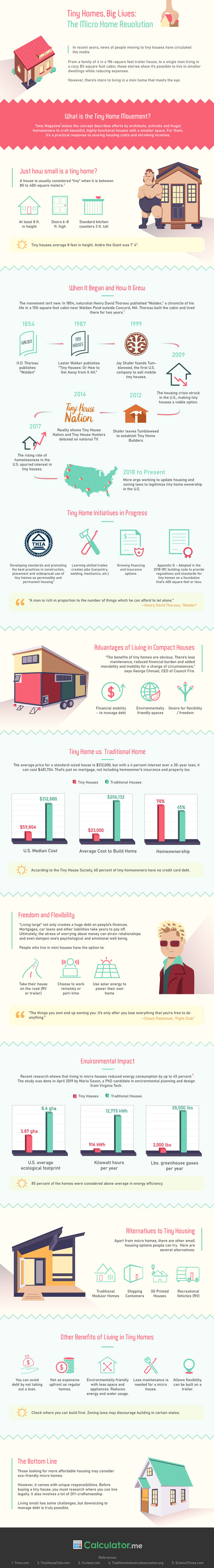Many of us have heard about people who have moved into tiny homes such as small cabins or trailer houses in the past. Some even go on adventures on small houses on wheels. Have you ever wondered when the tiny homes movement got started and what are the advantages of joining it? This infographic from Calculator.me can help: