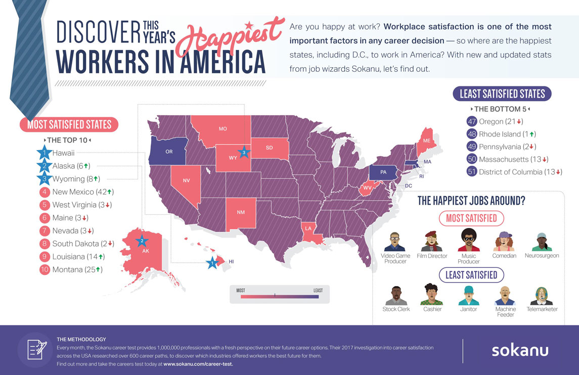 It is no secret that not everyone is happy with their work in every state. Certain states offer better conditions for workers to be satisfied with their job. This infographic from Sokanu takes a look at the states with the happiest workers: