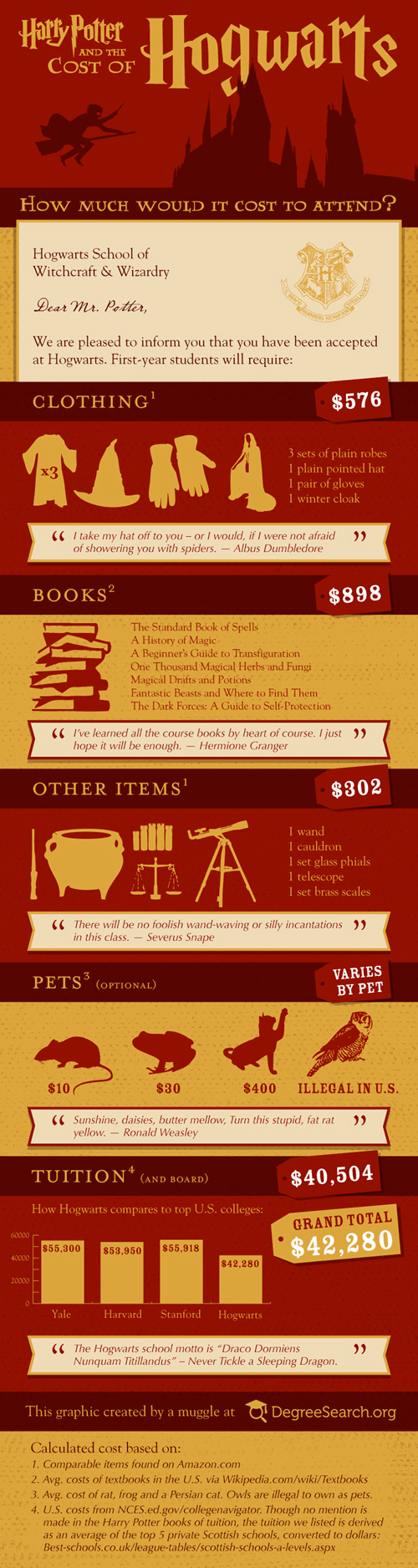 Harry Potter has millions of fans around the world. Not surprisingly, it would cost a fortune to attend Hogwarts if it were a real school. This infographic from DegreeSearch.org gives you a better idea how much: