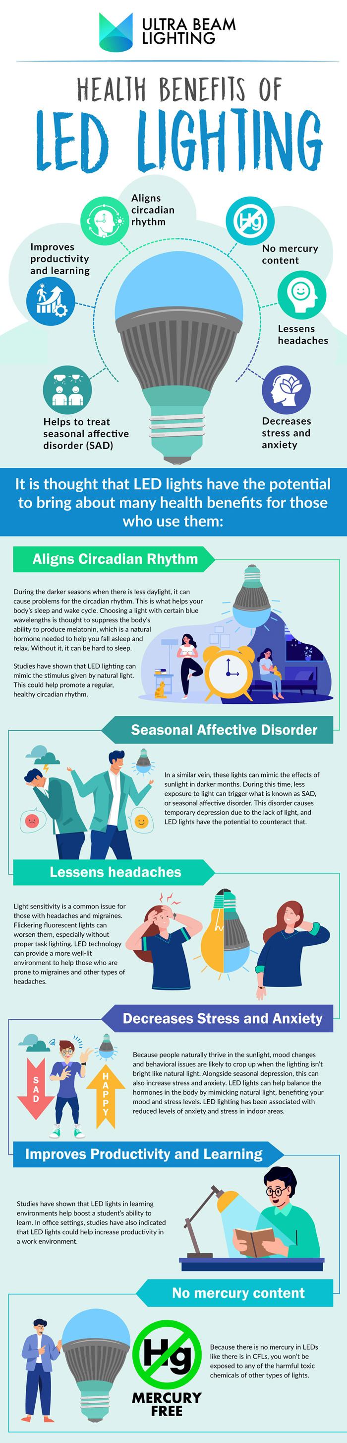It is no secret that proper lighting can improve your mood, help you become more productive, and even treat SAD. This infographic from Ultra Beam Lighting covers various benefits of LED lights: